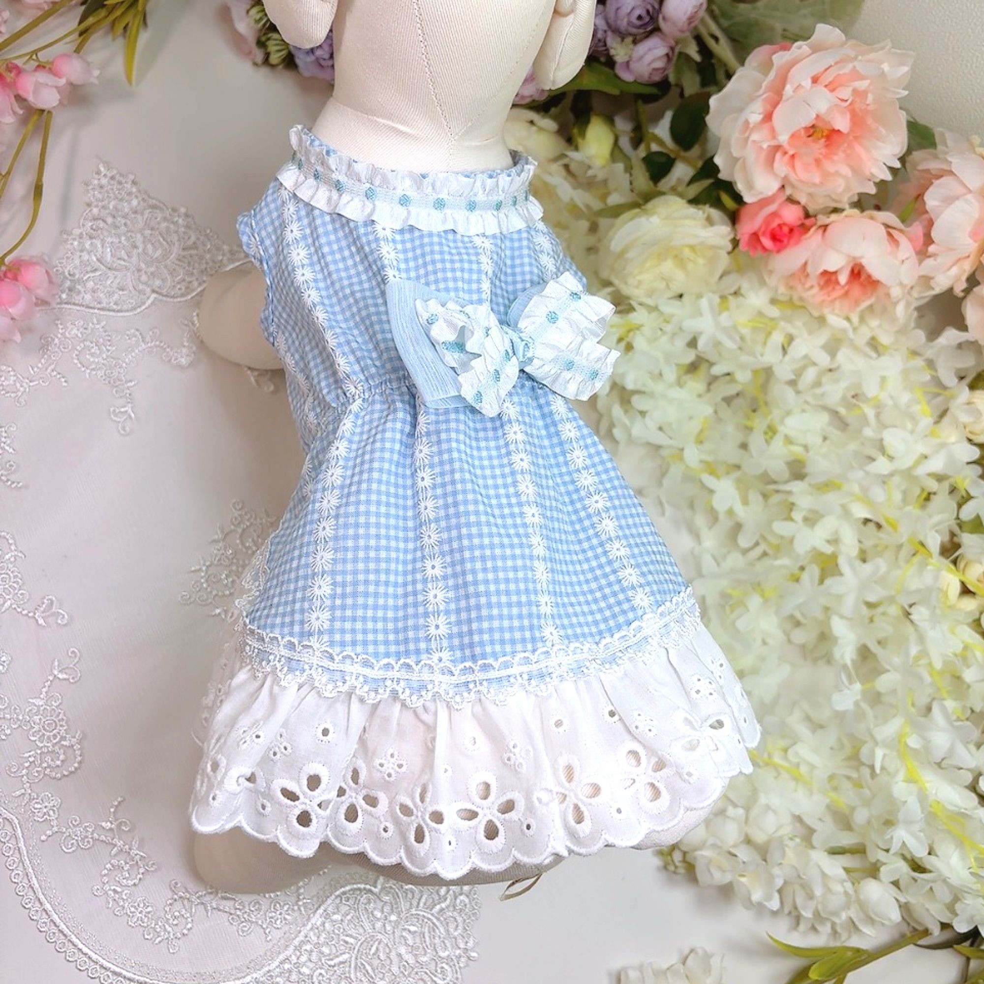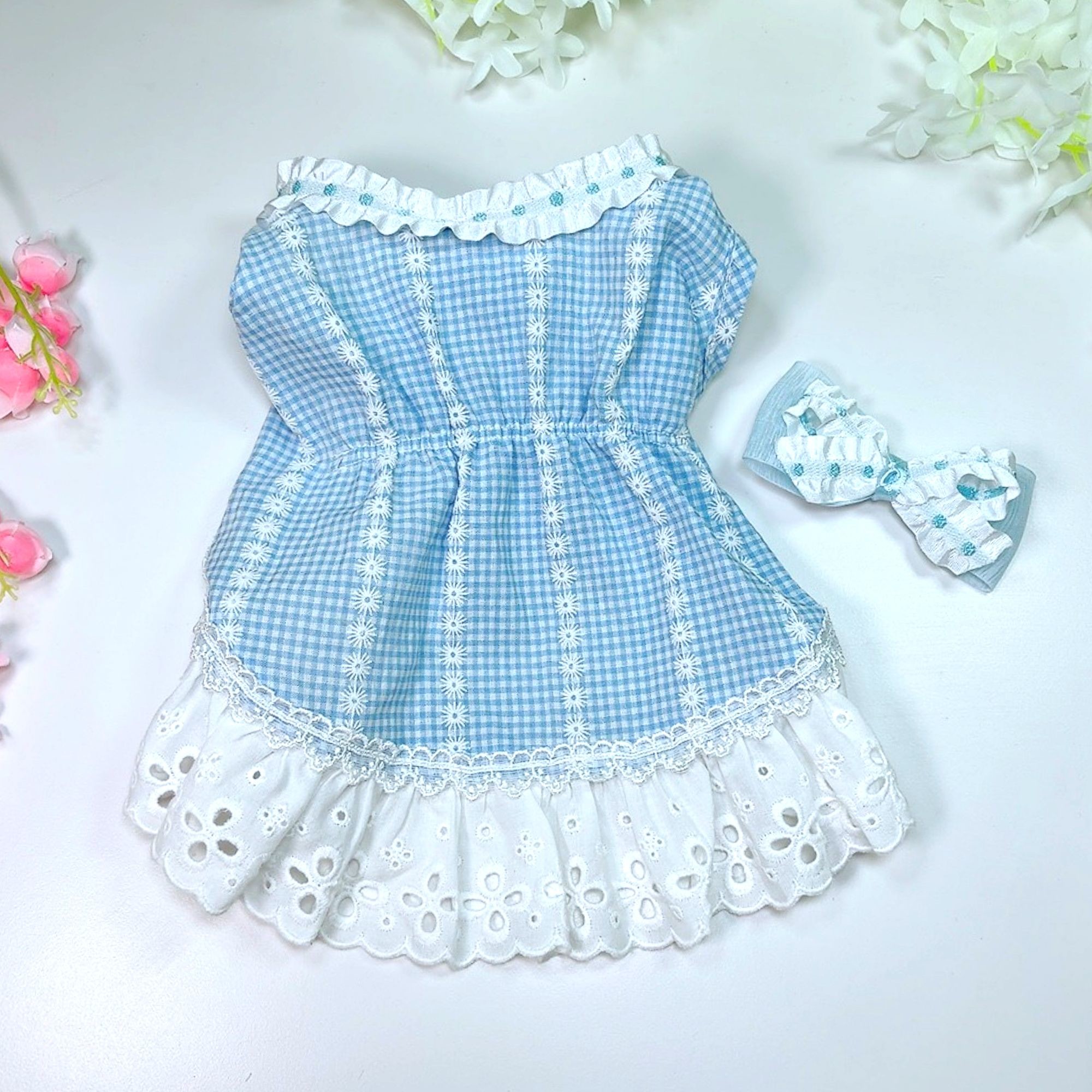 고급스런 블루고방체크에 하얀 플라워 프린트 드레스 ♥