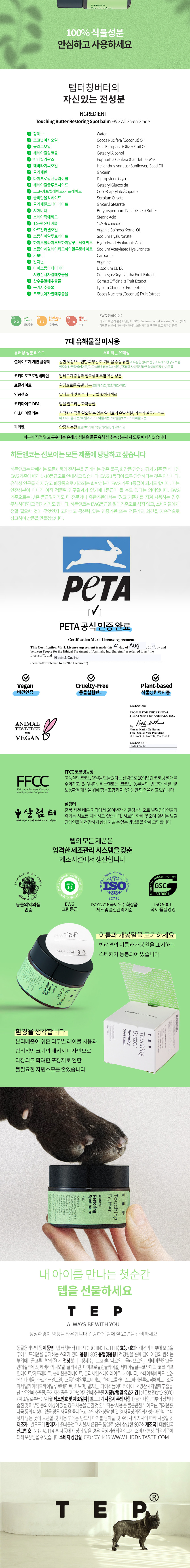 아이들의 피모 건강을 위해 식물성 원료만을 100% 이용했습니다. 히든테이스트 생과육 버진 코코넛 오일 6%, 판테놀, 3중 히알루론산 등 다량의 피모 보호를 위한 좋은 원료만으로 배합하였습니다.